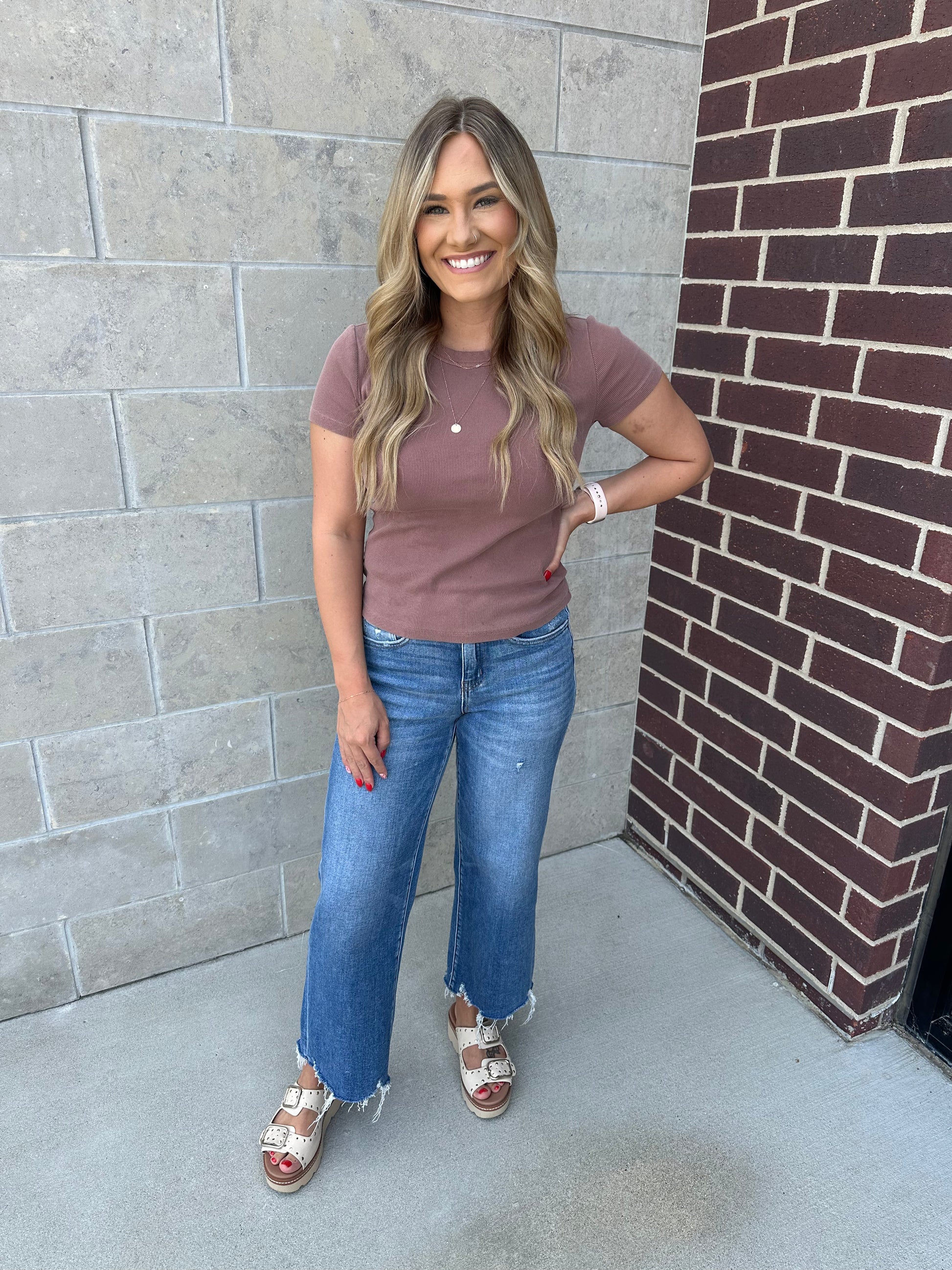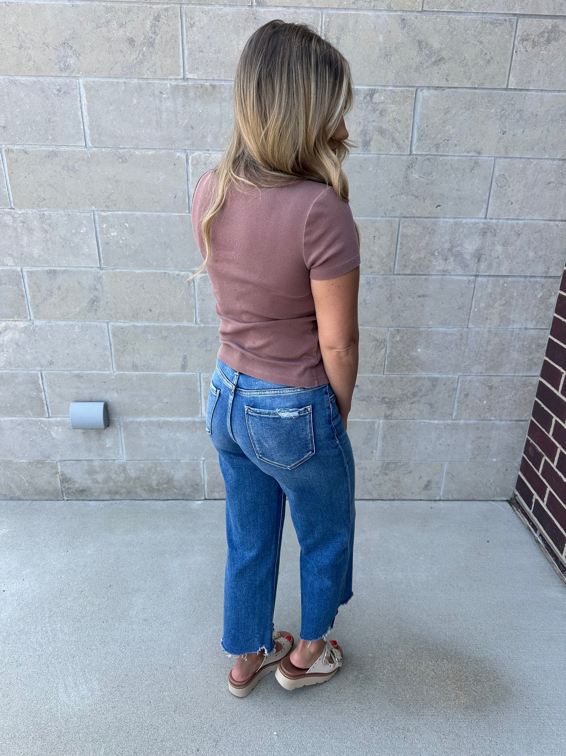 High rise cropped wide leg jeans. Comfortable stretchy denim with distressed detail.
